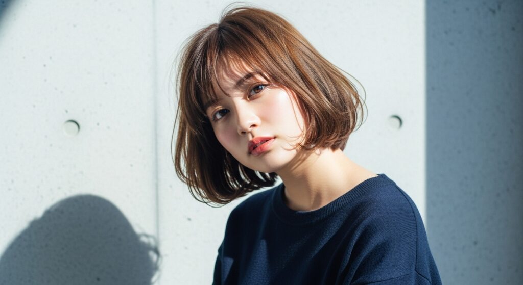 ひし形ボブは、横から見たときのシルエットがひし形になるように設計されたスタイル。頬のあたりにボリュームが集中するため、顔の輪郭をカバーしながら自然なふんわり感を実現できます。