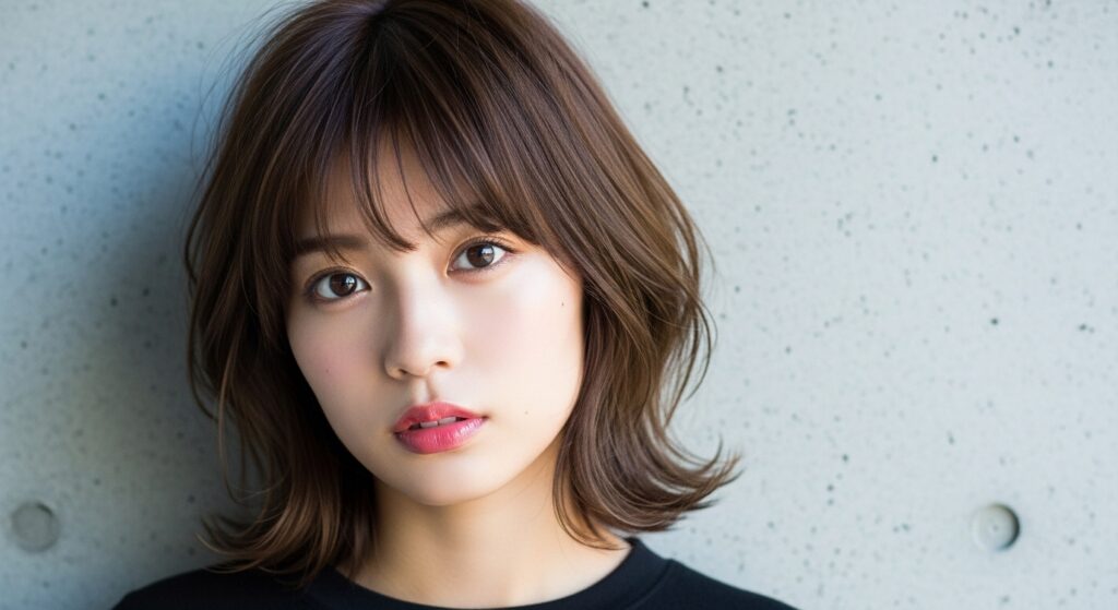 重めのベースながらも、ランダムな動きと絶妙な抜け感が魅力のミディアムスタイル。「こなれ感」と「大人可愛さ」を両立した今っぽいヘアスタイルです。SNSでは「#ゆるふわミディアム」「#こなれミディ」のタグで人気を集めています。